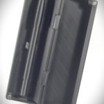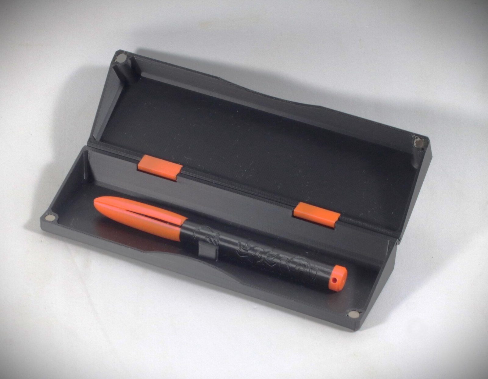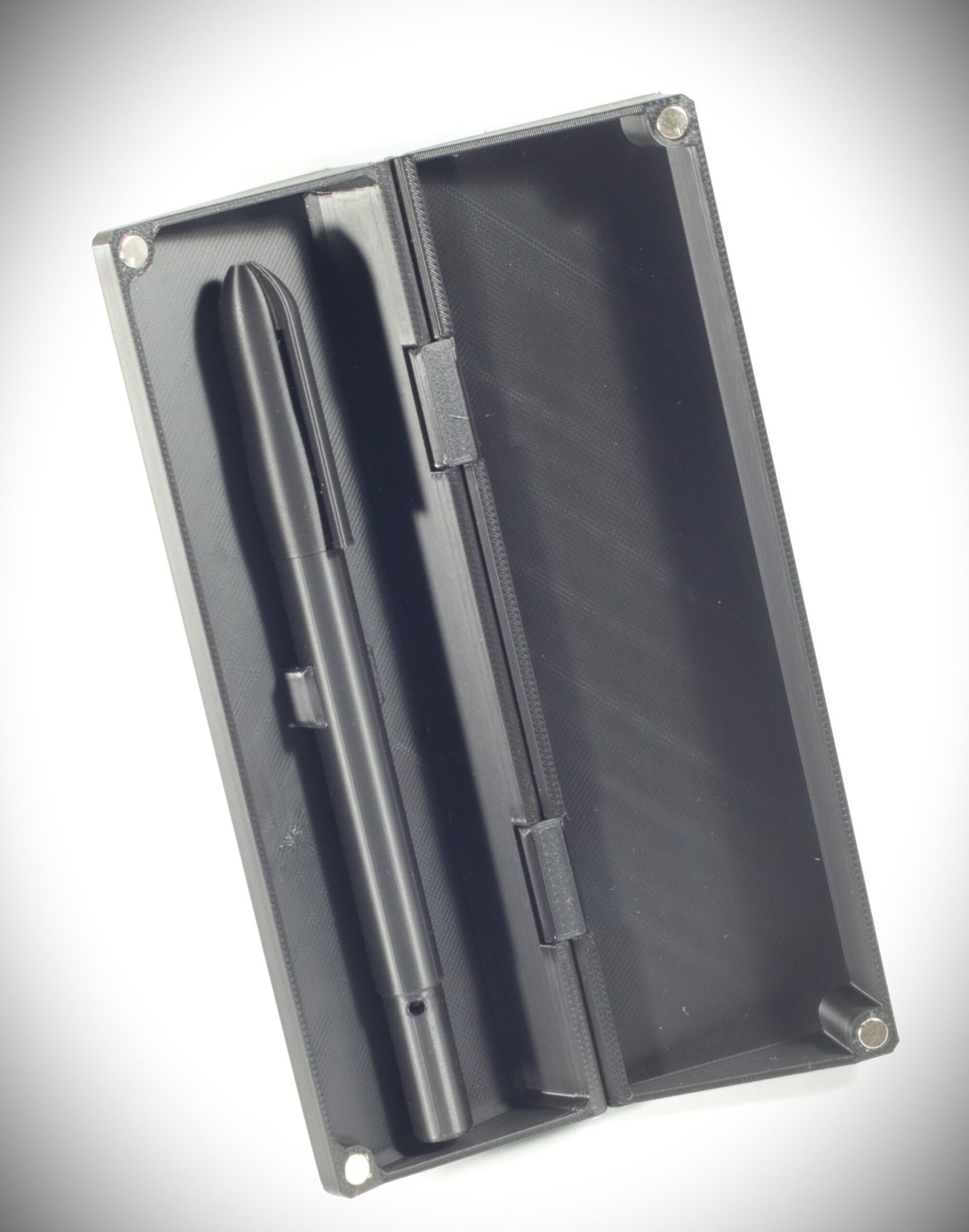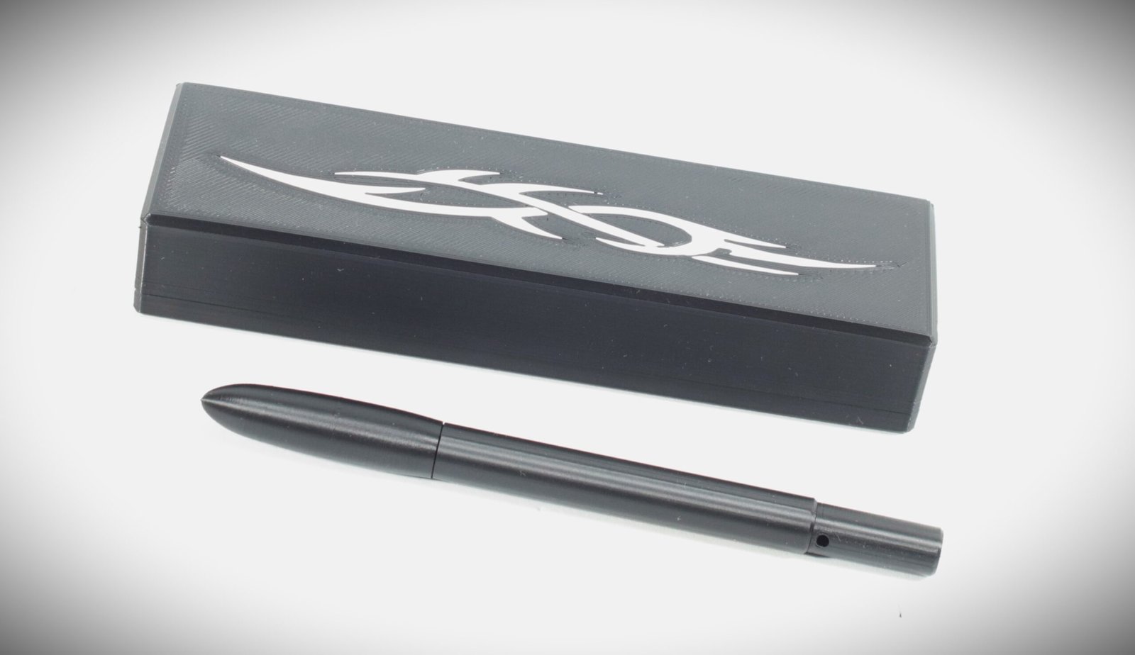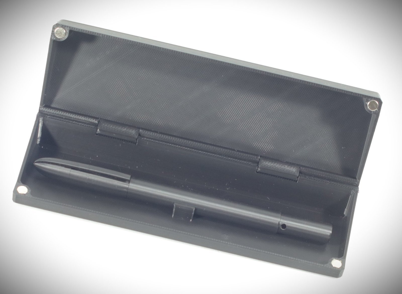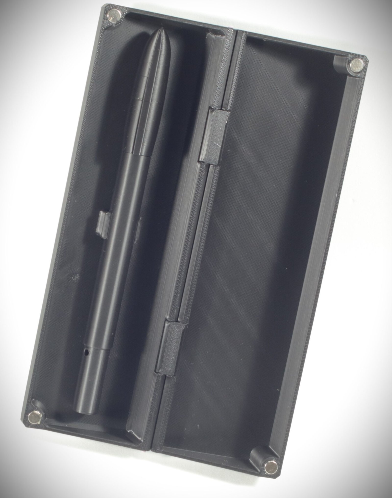La custodia abbinata, con chiusura a megneti, è decorata su entrambe le facce con lo stesso motivo e progettata per una doppia funzione: contenere la penna e trasformarsi in un portapenne da scrivania, rendendo il gesto di riporre o impugnare la penna fluido e naturale.